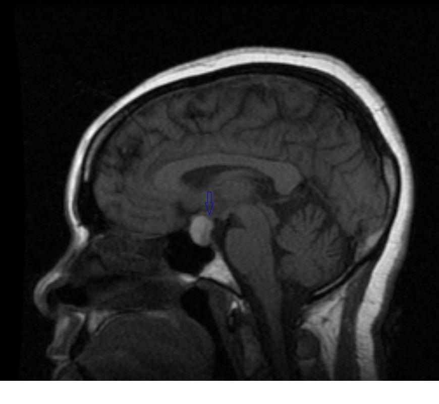 Figure A4: Sagittal T1-weighted image showing a macroadenoma in the sella extending superiorly (blue arrow), with an area of relatively low signal intensity in the posterior pituitary.