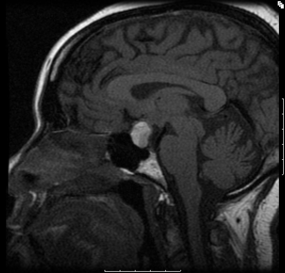 The initial brain scans were obtained 6 months after her initial diagnosis (3 months into her pregnancy) and revealed a hemorrhagic pituitary macroadenoma (Figures A1-4). The patient recollects that a week before the scan, she suffered an episode of severe headache with visual disturbance of the right eye. She did not seek medical attention at the time but did keep an appointment for the brain imaging the following week. At the time of the imaging, she reported that her symptoms had fully resolved.