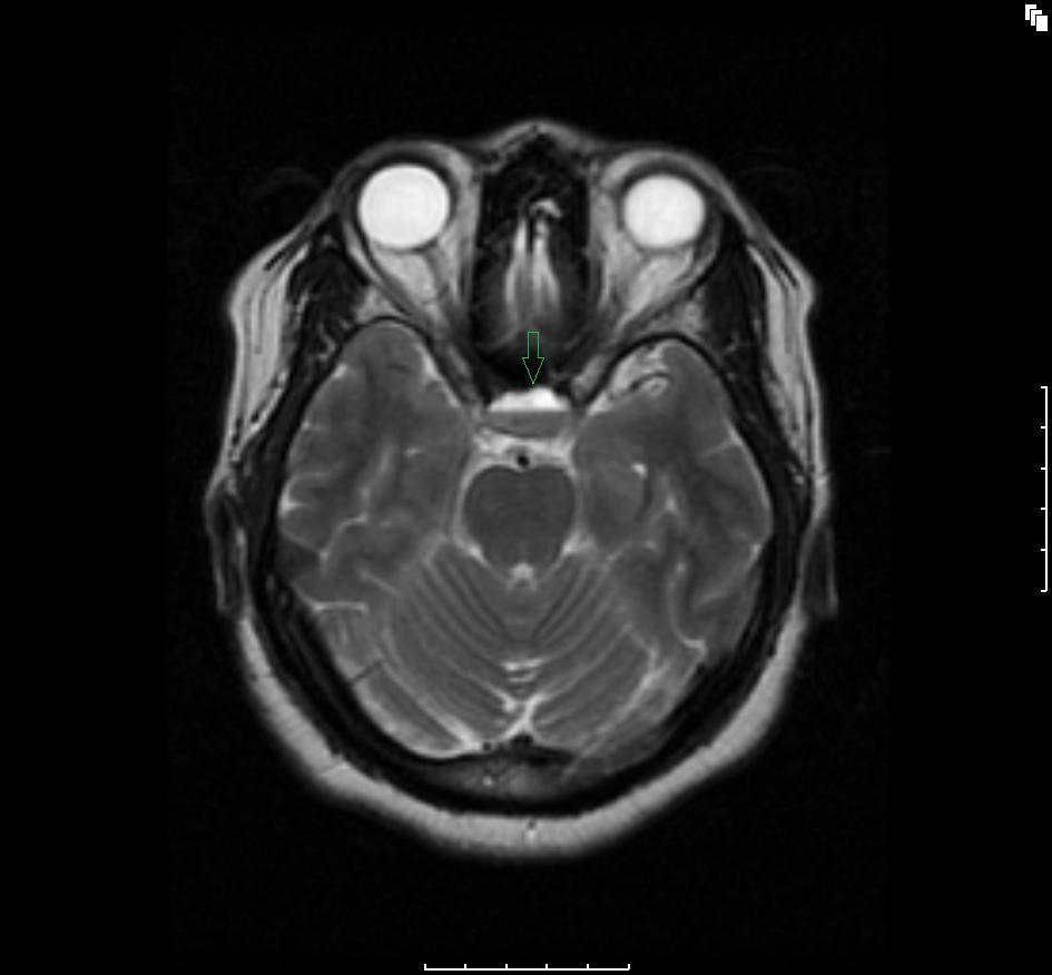 Figure A3: Axial flair T2-weighted 3 planar image showing a hypointense bottom layer and a hyperintense upper layer (green arrow) consistent with hemorrhagic pituitary macroadenoma.