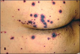 The patient’s temperature was 37.7°C (100°F); heart rate was 110 beats per minute; blood pressure and respiration rate were normal. He had erythematous macules and plaques on his face (A) and hemorrhagic bullae with central necrosis and crusts on his buttocks and lower extremities (B). Gram stain of blister fluid was negative for a pathogen.