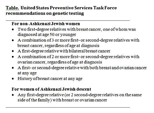 A thorough history is the key factor in determining whether genetic testing should be offered. The United States Preventive Services Task Force (USPSTF) on genetic testing recommends testing based on certain criteria (Table). Features in the history that increase the risk of hereditary breast cancer syndromes include the number of affected relatives, the degree of the relationship between the proband and the affected individual, young age at diagnosis, and multiple primary cancers. The presence of breast cancer in any male relatives should alert clinicians to the possibility of a hereditary breast cancer syndrome and requires testing. Women of Ashkenazi Jewish descent have a higher risk and thus a lower threshold for testing2,3 (Table). It is important to note that these recommendations do not apply to women with a family history of breast or ovarian cancer with known BRCA deleterious mutations.