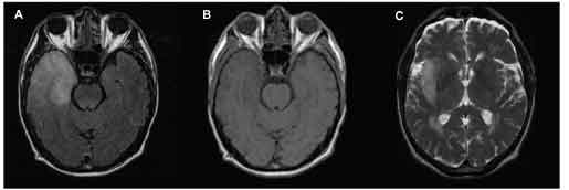Figure 2 – A gadolinium-enhanced MRI scan of the head shows a hyperintense lesion of the right anterior temporal lobe on a T2 fluid-attenuated inversion recovery image (A), which was hypointense on T1 (B), and extended into the adjacent inferior frontal lobe on T2 (C).