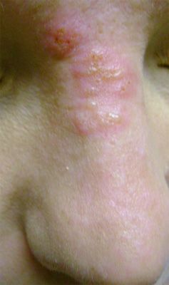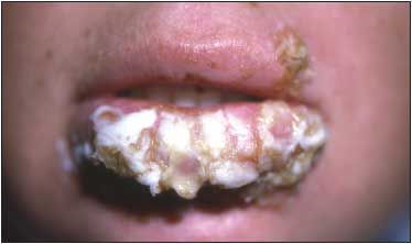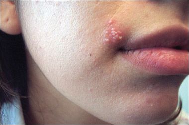 This young patient described a “tingling” sensation of several days’ duration before this painful lesion erupted. A positive Tzanck test confirmed the clinical suspicion of herpes labialis (orolabial herpes).