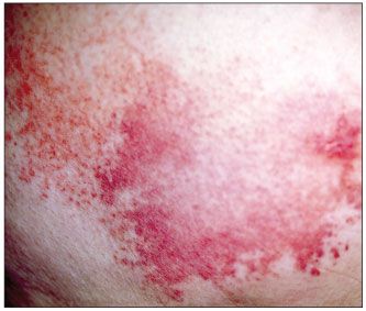 This widespread pruritic eruption on the buttocks of an elderly woman is an example of herpes simplex virus (HSV) type 2 infection. Genital herpes in women is seen most often on the outer vaginal lips (labia), vagina, cervix, around the anus, and on the thighs (see next image) or buttocks.