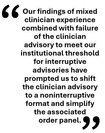 Despite these challenges, the integration of the advisory into standard EMR workflows and its visibility within clinical environments helped drive improvements. Staff cited the perceived clinical benefit and team-based approach as major facilitators. Phadke et al noted that the intervention's success suggests future EMR-based strategies should focus on optimizing workflow fit and minimizing clinician burden to sustain adoption.