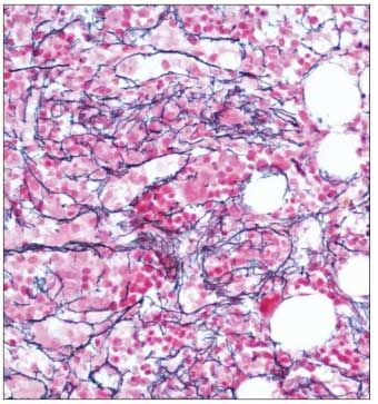 Figure 2.Low-power view of bone marrow showing increased reticulin fibrosis (hematoxylin and eosin stain, original magnification ×20).