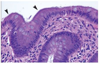 Figure 1.Biopsy specimen from right colon showing the luminal surface of the mucosa carpeted with a fine basophilic haze of spirochetes (hematoxylin-eosin stain, original magnification x400).
