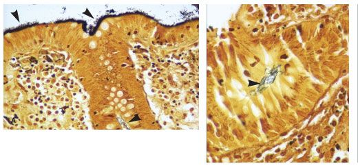 Figure 2. Biopsy specimen from colon at 55 cm demonstrated numerous slender organisms (left) (Steiner stain, original magnification x400). Individual crypt with readily recognizable spirochetes (right) (Steiner stain, original magnification x600).