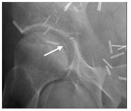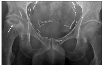 Figure 1.Anterior-posterior plain radiograph of the pelvis with subcortical lucency surrounded by sclerosis (arrow) indicating stage III osteonecrosis according to the classification system by Arlet, Ficat, and Hungerford (as reported in Steinberg and colleagues10: stage I, no changes; stage II, cystic and/or sclerotic changes without subcortical lucency; stage III, subcortical lucency and subchondral fracture; stage IV, subchondral collapse; stage V, joint narrowing. Surgical clips reflect previous radical cystectomy in this patient.