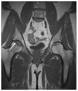 Figure 3.MRI of the pelvis with the "double line" sign (arrow) characterized by a high-intensity signal inside a low-intensity peripheral rim indicating osteonecrosis. Note the development of bilateral hip osteonecrosis in this patient.