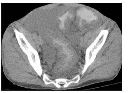 Figure 1.Abdominal CT scan without contrast from a 45-year-old HIV-infected man showing diffuse marked thickening of the colon.