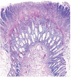 Figure 4.Histological examinaton of a section of a pseudomembrane in a 45-year-old HIV-infected man reveals focal superficial erosion ("exploding crypts") covered by an acute inflammatory exudate (hematoxylin and eosin stain).
