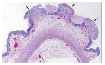 Figure 3. Low-power microscopic view of mucosal pseudomembranes (arrows) in a 45-year-old HIV-infected man (hematoxylin and eosin stain).