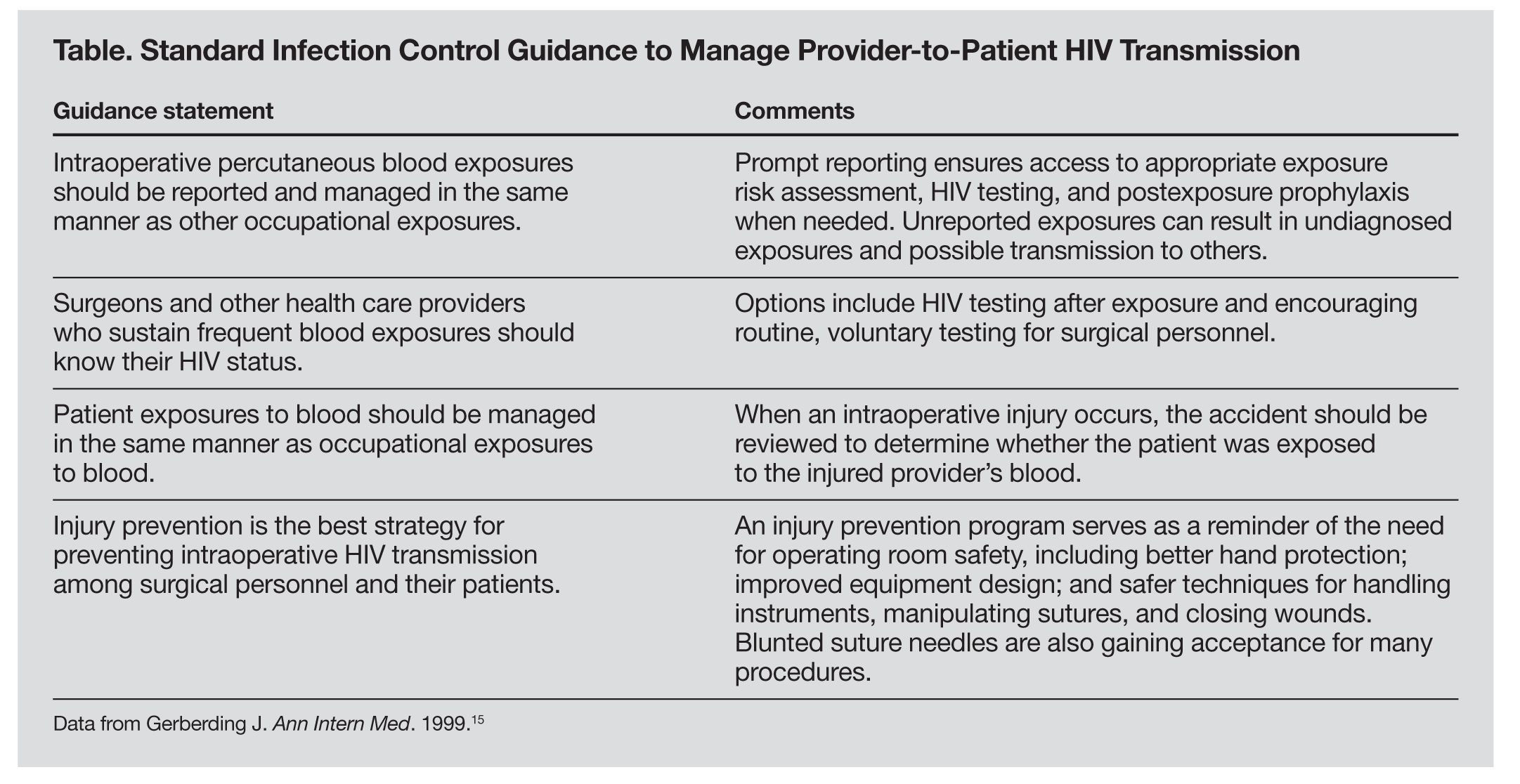 In 1999, Gerberding,15 in an editorial, offered what became, at the time, the standard infection control guidance on how to keep the risk of provider-to-patient HIV transmission low. Gerberding’s points, which are summarized in the Table, are based on the assumption that surgical personnel are at risk for occupationally acquired HIV infection, and all of her points make sense. However, these recommendations have been unevenly implemented, even today and, in particular, the appropriate reporting of possible exposures to blood during surgical procedures.