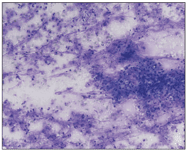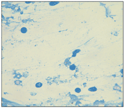 Figure 3.DipQuick cytological stain of lung aspirate (magnification x400) showing inflammatory cells and necrosis. (Illustration courtesy of the department of Papanicolaou cytology, New York Presbyterian Hospital–Weill Medical College of Cornell University, New York.)