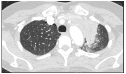Laboratory analysis revealed a white blood cell count of 3400/µL, with 80% neutrophils and 12% lymphocytes; a hematocrit of 28% with normal platelet count; albumin, 2.9 g/dL; and serum protein, 7.7 g/dL. A chest radiograph revealed a left upper lobe infiltrate (Figure 1). A chest CT scan further characterized this apical infiltrate as a mass-like consolidation with associated lymphadenopathy (Figure 2).
