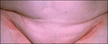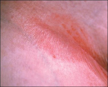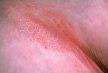 The axillae, perineum, inframammary creases, and abdominal folds are the most common sites of involvement. The apposed skin surfaces rub against each other, causing erosions that become inflamed. Sweat, feces, urine, and vaginal discharge may aggravate intertrigo.