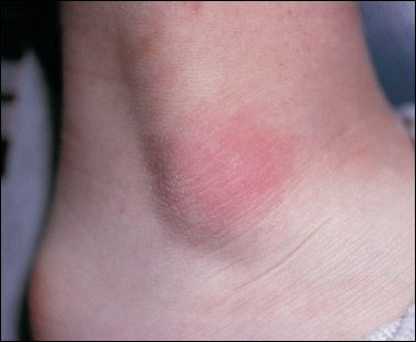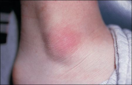 During a routine checkup, a 14-year-old girl inquires about a large red spot on her right ankle. The asymptomatic, erythematous area overlying the malleolus has been present for several months.