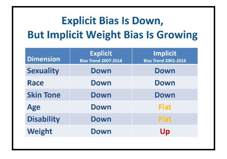 Nonetheless, this misunderstanding is the foundation for pervasive, implicit weight bias. While explicit weight bias has declined, research shows that implicit bias has grown. In part because of this bias, the utilization of intensive behavioral therapy, pharmacotherapy, and bariatric surgery remains low in absolute terms.