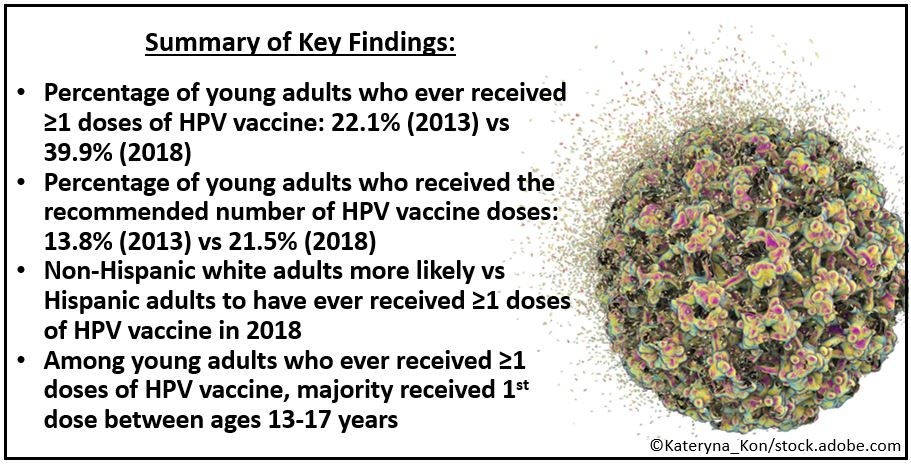 Among all US adults aged 18-26 years, the percentage who ever received ≥1 doses of the HPV vaccine rose from 22.1% in 2013 to 39.9% in 2018, reported authors Peter Boersma, MPH, and Lindsey I. Black, MPH, of the NCHS Division of Health Interview Statistics.