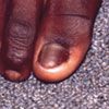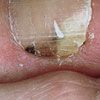 A routine examination of a 54-year-old man reveals an isolated 3-mm dark brown streak on the fourth toe. The patient does not recall any trauma to that foot and was unaware of the streak until it was pointed out to him during the examination. There is no pigmentation of the adjacent skin.
