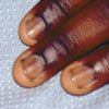 This patient’s nail dyschromia was most likely caused by hydroxyurea, which produces hyperpigmentation in about 10% of persons who take the medication, especially those who are dark-skinned.1 The clearing of the middle portion of the fingernails probably correlates to the patient's temporary discontinuation of hydroxyurea a few months earlier.