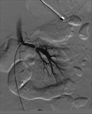 A 3-year-old boy with elevated blood pressure was brought in for vague abdominal pain. A hypertension evaluation revealed no definite abnormality. This angiogram shows a thread-like appearance of the left main renal artery, just proximal to the bifurcation, confirming a diagnosis of renal artery stenosis. Repeated blood pressure measurements confirmed that the boy had stage 2 hypertension.