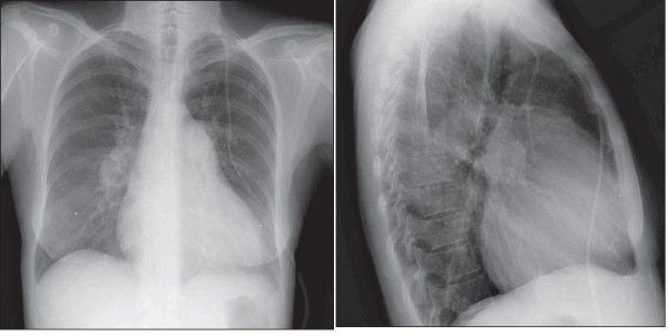 Cardiomegaly and prominent bilateral pulmonary arteries in the hilar areas can be seen in the posteroanterior chest radiograph from a patient with idiopathic pulmonary arterial hypertension. The lateral view also reveals enlarged pulmonary arteries and cardiomegaly without any evidence of congestive heart failure.