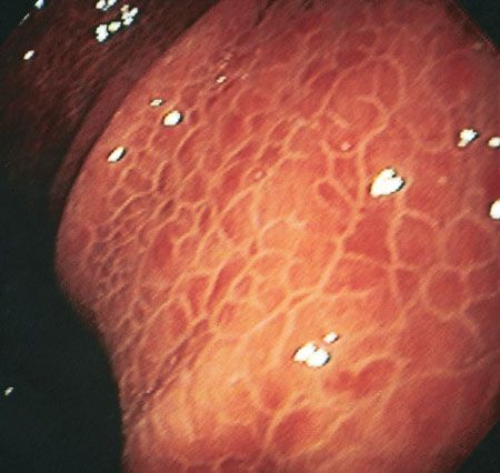 This endoscopic view shows the stomach of a 52-year-old man with a history of chronic hepatitis C and alcohol abuse who was hospitalized because of bleeding esophageal varices. Seen is the classic macroscopic “snakeskin” appearance of portal hypertensive gastropathy-a fine reticular pattern that separates areas of erythematous mucosa. Histological examination disclosed extensive edema and submucosal vessel dilation.