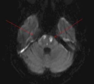 A 30-year-old woman with a history of hypertension, hyperlipidemia, diabetes, chronic kidney disease, and polysubstance abuse had a sudden change in mental status, weakness on her right side, slurring of speech, and new-onset dysphasia. Her blood pressure was 190/95 mm Hg. Brain DW-MRI showed patchy areas indicating increased signal in the pons on both sides; repeated DW-MRI showed a diffusion abnormality. She had a stroke attributed to hypertension caused by cocaine abuse.