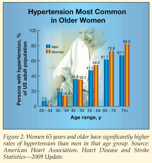 Prevalence of hypertension is higher among men than women until age 45 years (Figure 2). From ages 45 to 64 years, hypertension prevalence is nearly equal between men and women. After age 65 years, prevalence of hypertension is significantly higher among women.