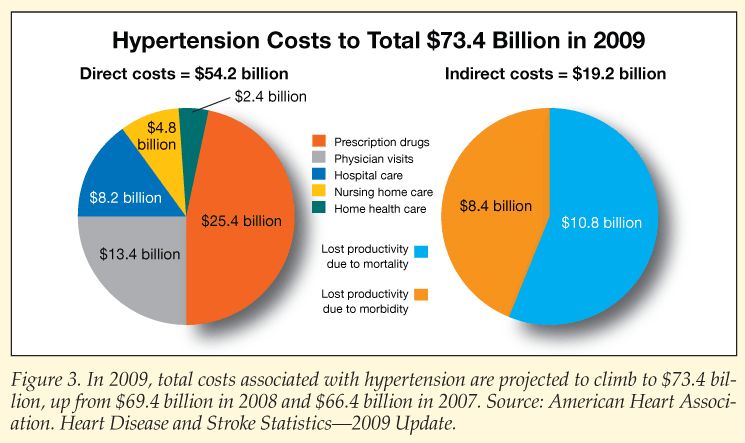 The American Heart Association estimates that hypertension will cost the US economy $73.4 billion in direct and indirect expenditures in 2009, up from $69.4 billion in 2008 and $66.4 billion in 2007 (Figure 3). Direct costs are projected to reach $54.2 billion in 2009, of which prescription drugs alone will total $25.4 billion.