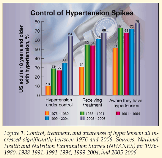 Although incidence of the condition continues to rise, the percentage of persons in whom hypertension is controlled increased to 64% in 2005-2006, up from 35% in 1999-2004 (Figure 1). Among persons who used antihypertensive agents, those aged 18 to 59 years were more likely to achieve blood pressure control than those 60 years and older (72% vs 58%). Treatment levels and awareness of hypertension also showed significant increases during the period. Overall, 68% of adults were being treated with an antihypertensive therapy regimen and 78% of adults were aware of their condition. Men aged 18 to 59 years were much less likely (47%) than women in that age group (74%) to take their medication as directed.