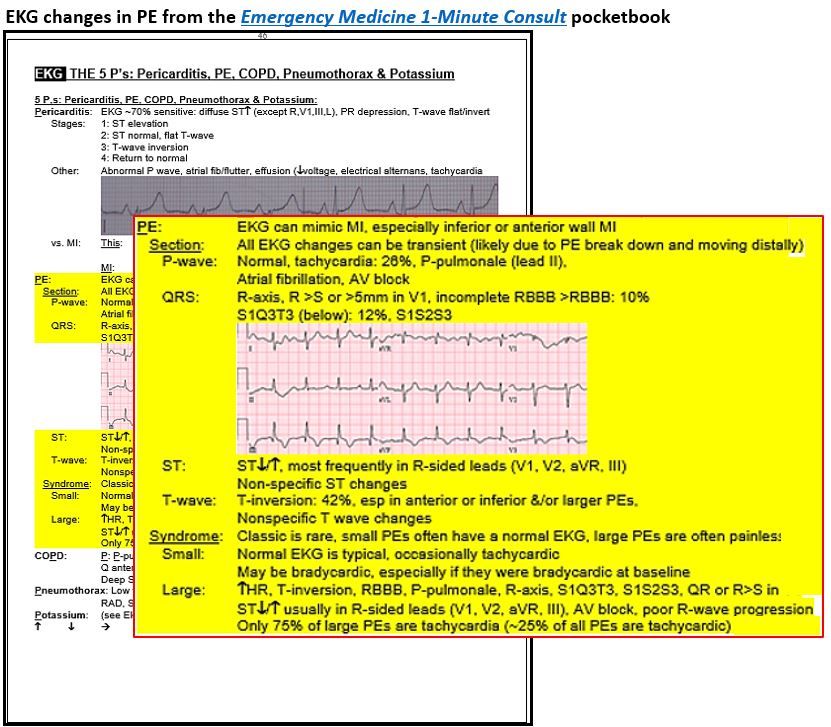 For additional information, please see full excerpt on EKG Changes in PE from The Emergency Medicine 1-Minute Consult pocketbook