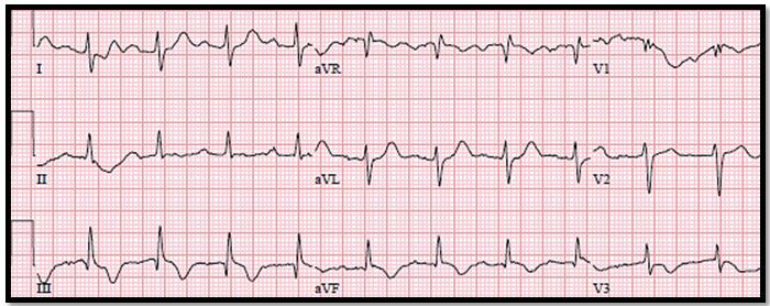 The 82-year-old is observed to be in respiratory distress but denies any symptoms. See the ECG for more information. Your dx?