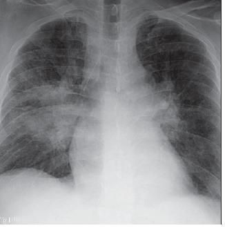 Figure 1 – Bilateralinfiltrates with right lung perihilar consolidation can be seen in the chest radiograph taken 11 days after the initiation of sulfasalazine therapy. Other radiographic findings include a left mid-lung zone infiltrate and bilateral perihilar interstitial prominence.