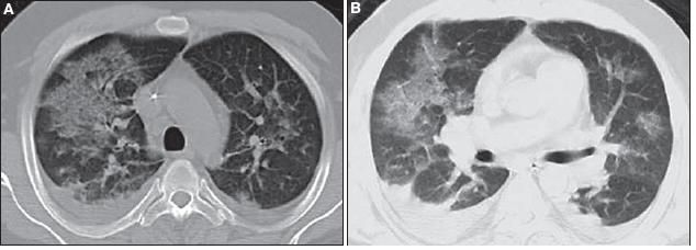 The chest radiographic findings are abnormal and include alveolar infiltrates, interstitial markings, and nodules.10,17 Although most cases have reported mid- to lower lung zone distributions,18 a few have described upper lobe alveolar infiltrates.19-21 Chest CT scans typically show infiltrates and ground-glass opacities, with a mid- to lower lung zone distribution; upper zone disease has been reported in a minority of cases.