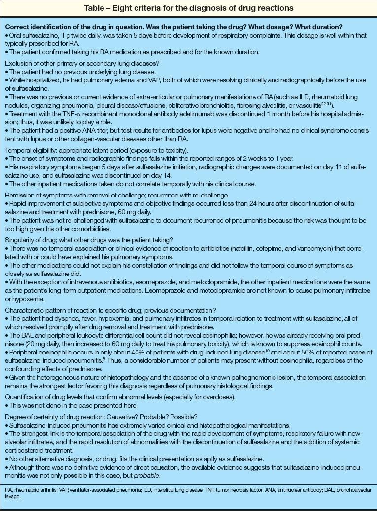 the temporal associations, could be explained only by sulfasalazine- induced pneumonitis. To assess this further, we reviewed 8 criteria for the diagnosis of drug reactions (Table).2