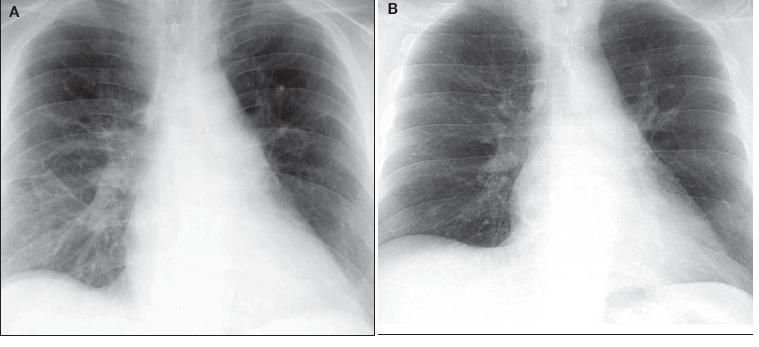 Figure 3 – Significant interval improvement was detected after 12 days of prednisone treatment (A). After 30 days of prednisone, complete radiographic resolution was seen (B).