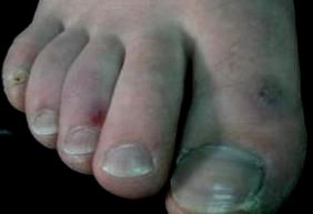 • Typical lesions are red-purple patches, papules or plaques, most commonly affecting the feet. They are usually painful, but may itch or burn. Women are disproportionately affected.
