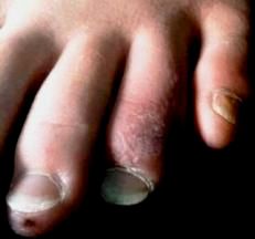 The patient was seen 2 times, 10 days apart. At the first visit, the left fourth toe was mildly swollen and was slightly purple. There were small violaceous macules on the ends of several toes. Ten days later, most of the swelling and purplish discoloration of the affected toe had resolved, but there was still a faintly violaceous plaque on the top of the toe. Purple macules were noted on the tip of the left third toe and on the medial aspect of the right third toe, near the nailbed (Figures). At this visit she was wearing brown leather boots with cotton socks. The complete blood count was normal. Erythrocyte sedimentation rate was 3 mm/h. Assays were negative for antinuclear antibodies and rheumatoid factor.