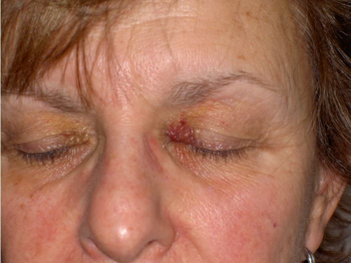 Eyelid bruising was observed on a 64-year-old woman during routine skin cancer follow-up. She denied trauma or pain. What does this look like to you?