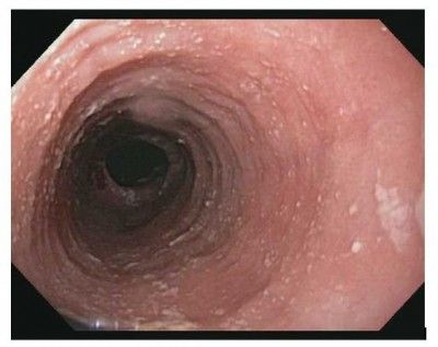 A 25-year-old man presents with dysphagia to solids that has progressed over the past year. He now avoids breads, meats, and other foods he fears may lodge in his esophagus. Liquids present no problem. PMH includes eczema and seasonal allergies. Upper endoscopy image is shown above.