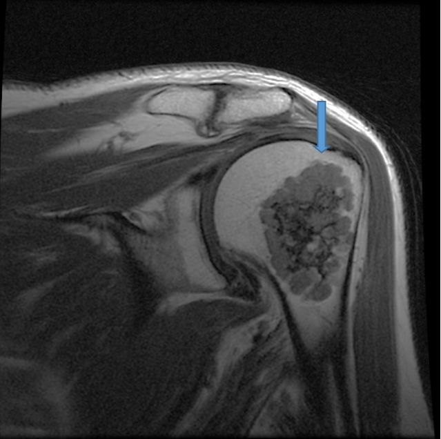 Figure 4. Noncontrast multisequence mutiplanar magnetic resonance (MR) imaging demonstrates a well-circumscribed lobulated lesion within the metaphysis of the proximal humerus demonstrating heterogeneous diminished signal on T1-weighted images and heterogeneous bright signal on T2-weighted images characteristic of chondroid matrix. It measures 5.1 cm length x 3.9 cm in width x 2.9 cm in AP dimension. The adjacent cortical bone is intact with no endosteal scalloping. There is no soft tissue component. Impression: benign-appearing enchondroma.