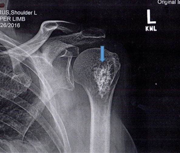 In addition to pneumonia, the final radiologic report mentioned “lytic lesions in the proximal left humerus” (Figure 1, arrow) and recommended follow up with an orthopedic specialist. The patient had no history of cancer, no bone pain, or limitation of range of motion of the left arm.
