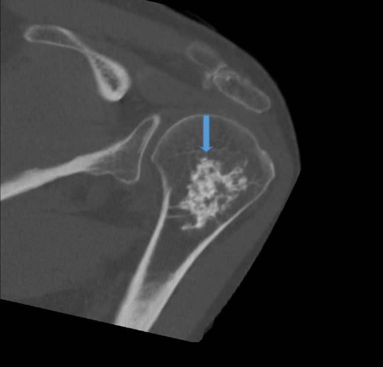 Figure 3. Noncontrast axial computed tomography (CT) of the left shoulder reveals a lobulated lesion within the proximal humeral metaphysis with chondroid matrix, consistent with enchondroma. The adjacent cortical bone is intact. The lesion measures approximately 5 cm in length.