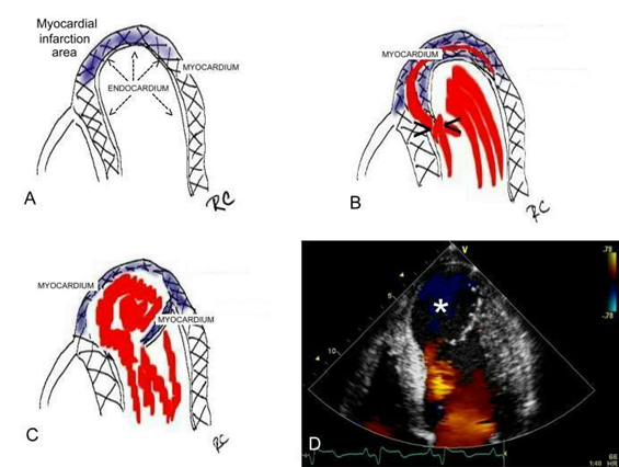 Figure 5. Sequence of events after acute MI that lead to the loss of left ventricular wall integrity and intramyocardial dissection and development of a large anterior septal and apical aneurysm. A. Left ventricle showing endocardial and myocardial layers with areas of infarction. B. Open arrows show the point of wall disruption and the splitting in two of the myocardial wall. C and D. Schematic drawing and correlated echocardiographic image, revealing the aneurysmatic dilatation (see*) and hanging myocardial/endocardial wall in the left ventricle (intramyocardial dissection with incomplete LV rupture) as a result of acute anterior wall ST-segment elevation MI.