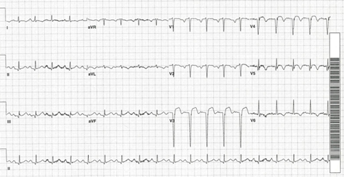 The ECG revealed sinus tachycardia and ST segment elevation from V1 to V4, II, III, and aVF with associated Q waves. These findings were consistent with a recent acute anterior wall ST-segment elevation MI (Figure 1).