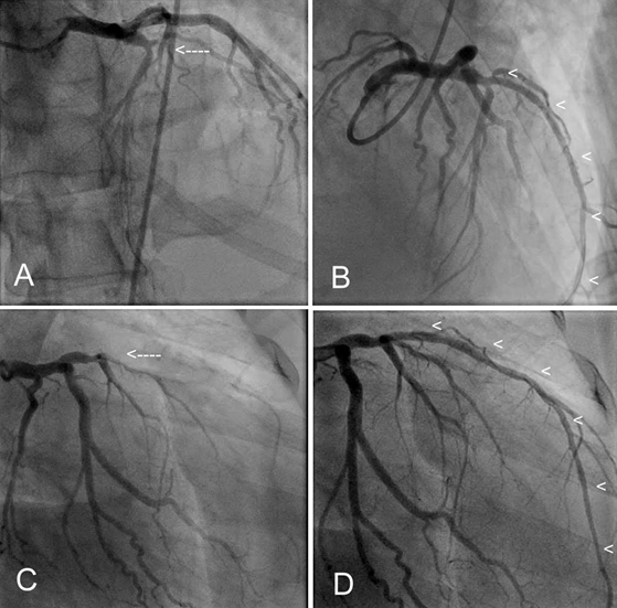 Emergent cardiac catheterization revealed total thrombotic occlusion of the mid left anterior descending coronary artery (Figure 2A and 2C). The remaining coronary arteries revealed only luminal irregularities; left ventriculography showed a severely decreased left ventricular ejection fraction of about 15%. Successful manual thrombectomy followed by bare metal stenting was performed (Figure 2B and 2D).