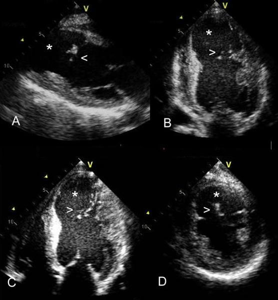Figure 3. Echocardiographic views (A. Parasternal long axis view; B. Apical 2-chamber view; C. Apical 4-chamber view; D. Parasternal short axis view of the left ventricle) revealing an apical dilatation of the left ventricle (see*), with small mobile intraventricular densities (arrow head) suggestive of a left ventricular aneurysm or a pseudoaneurysm.